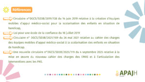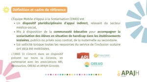 L’Equipe Mobile d’Appui à la Scolarisation (EMAS) est un dispositif médico-social pluridisciplinaire d’appui mis à disposition de la communauté éducative pour accompagner la scolarisation des élèves en situation de handicap, dans les établissements scolaires, de la maternelle au lycée.