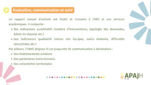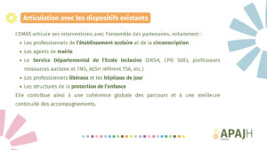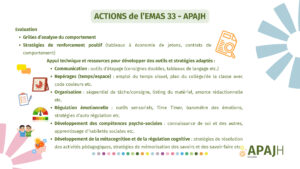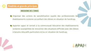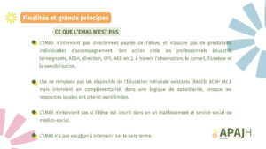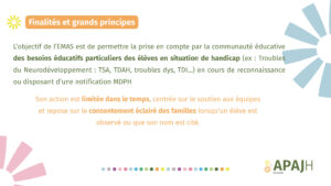 L’objectif de l’EMAS est de permettre la prise en compte par la communauté éducative des besoins éducatifs particuliers des élèves en situation de handicap (ex : Troubles du Neurodéveloppement : TSA, TDAH, Troubles DYS, TDI…) en cours de reconnaissance ou disposant d’une notification MDPH.