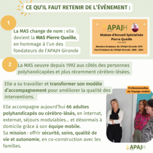 En présence du Président : M. Georges Dupon-Lahitte, des administrateurs de l’association, de la Direction de l’APAJH Gironde (M. Michel Keisler, Directeur Général), des professionnels de la MAS, des bénéficiaires, de leurs familles, et de l’ARS Nouvelle-Aquitaine, représentée par Mme Cécile TAGLIANA, Directrice Générale Adjointe, cette matinée a été l’occasion de :