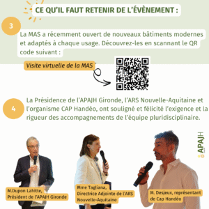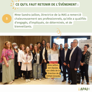 Les discours de M. Georges DUPON-LAHITTE (Président de l’APAJH Gironde), Mme Cécile TAGLIANA, Mme Sandra JAILLON (Directrice de la MAS Pierre Queille) et M. Cyril DESJEUX (Cap Handéo) ont mis en lumière l’engagement des équipes et la qualité des accompagnements, couronnée par la certification polyhandicap délivrée par Cap Handéo.