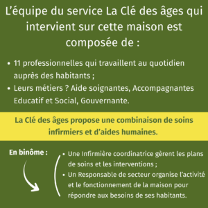 L’équipe est composée de 11 professionnelles (Aides-soignantes, Accompagnantes Educatif et Social et une Gouvernante…), qui accompagnent les 5 habitants dans leur quotidien, tout en collaborant étroitement avec des acteurs médicaux et paramédicaux du territoire (médecins, kiné, infirmiers, …).