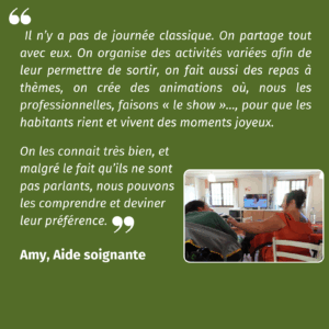 « Il n’y a pas de journée classique. On partage tout avec eux. On organise des activités variées afin de leur permettre de sortir, on fait aussi des repas à thèmes, on crée des animations où, nous les professionnelles, faisons « le show »…, pour que les habitants rient et vivent des moments joyeux. On les connait très bien, et malgré le qu’ils ne sont pas parlants, nous pouvons les comprendre et deviner leurs préférences. » — Amy, aide-soignante
