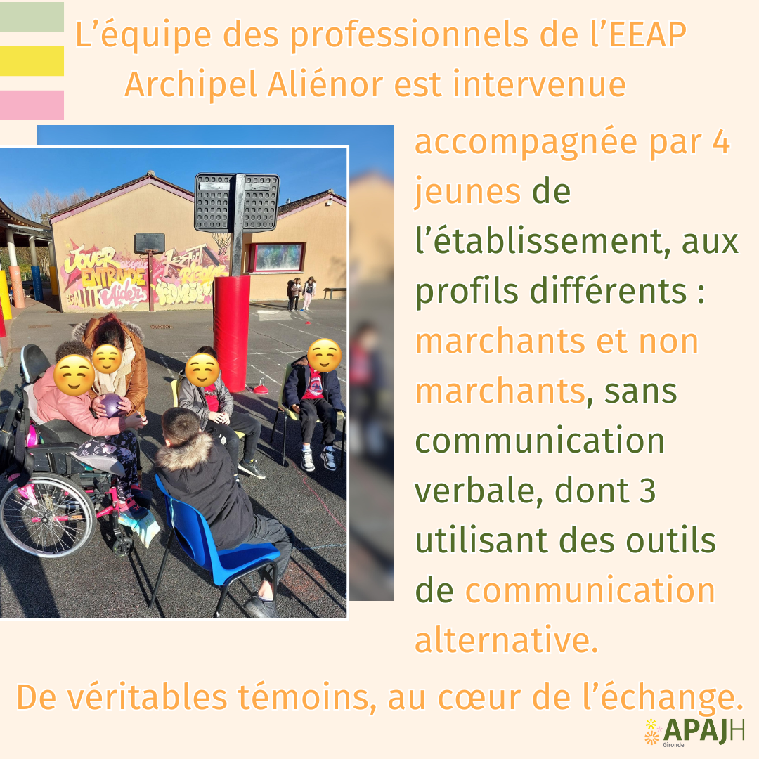 Parmi les parents mobilisés, une maman s’est immédiatement manifestée. Salariée de l’APAJH Gironde, elle connaît bien le handicap chez l’enfant puisqu’elle travaille au sein de l’Etablissement pour Enfants et Adolescents Polyhandicapés Archipel Aliénor situé Blanquefort.